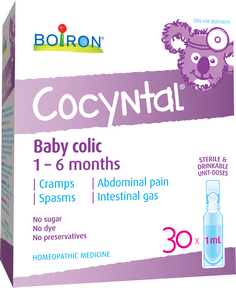 Cocyntal is a homeopathic medicine to help relieve baby colic symptoms: abdominal pain, cramps, spasms and intestinal gas. Boiron Cocyntal is developed for babies ages 1-6 months and contains no sugar, dye, or preservatives.