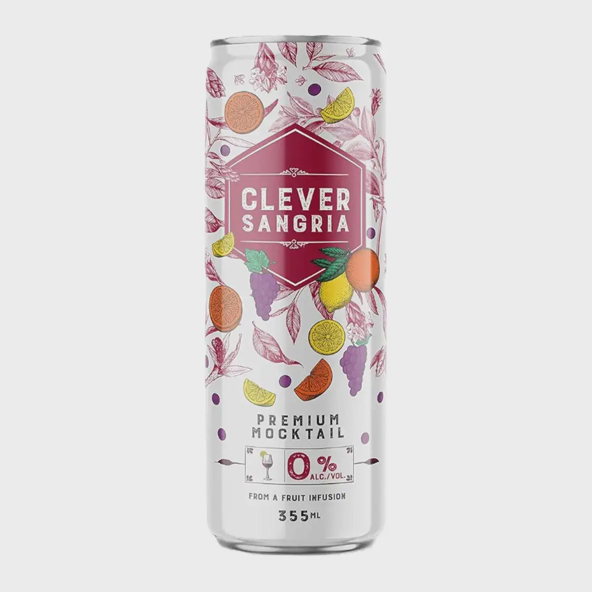 Clever Mocktails Clever Sangria is a premium Mocktail made from a fruit infusion. 0% Alcohol. Ingredients:Carbonated Water, Orange and Lemon Peel Infusion, Sugar, Natural Flavours, Amaranth, Tartaric Acid.