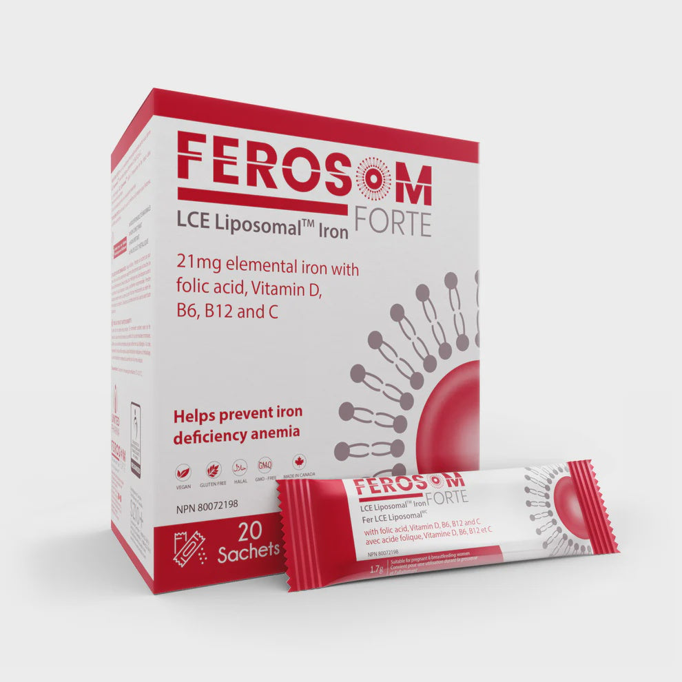 As recommended by OBGYNs across Canada, Ferosom Forte is an iron pyrophosphate microencapsulated in Liposomal form, providing exceptional iron absorption but with the addition of the LCE coating, unparalleled improvement in iron levels can be achieved. The proprietary LCE coating technology which allows for safe passage through the acidic stomach environment to provide very high absorption where it is needed.