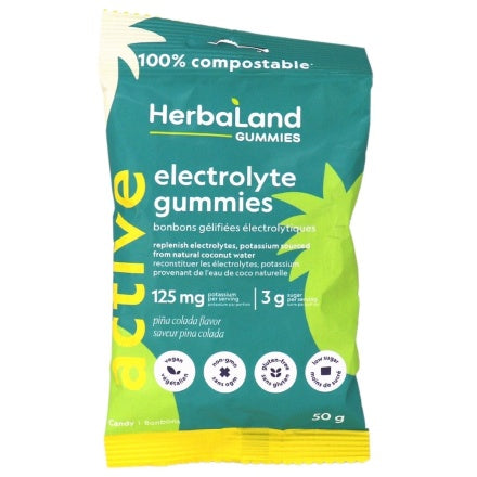 Replenish your electrolytes with Herbaland pina colada flavoured gummies! These vegan and gluten-free gummies contain the perfect amount of electrolytes to help you recover after a heavy workout. Each gummy contains a blend of sodium, potassium, magnesium, and calcium to allow you to recover quickly and keep dominating every rep, every set, and every stride.